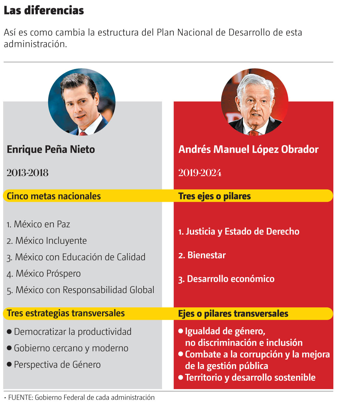 Además de tres estrategias transversales: Democratizar la productividad, Gobierno cercano y moderno, y Perspectiva de México. El proyecto del gobierno actual no consideró el objetivo en política exterior.