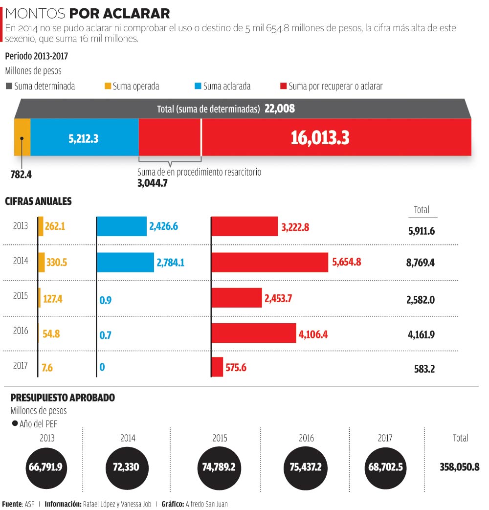La ASF reporta que de los 16 mil 13 millones de pesos por aclarar en esos años, solo 3 mil 44 se encuentran en procedimiento resarcitorio, lo que significa que ya se tiene localizadas a las personas responsables del posible uso indebido del dinero público, y en qué sitios trabajaban, pero que por cuestiones legales o administrativas no han resarcido el daño al erario desde 2013. Del resto, de más de 12 mil millones pesos, no.