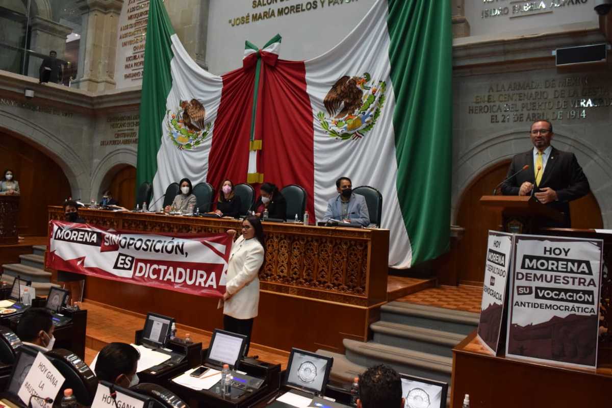 Los panistas, perredistas y ecologistas se organizaron y llevaron letreros con mensajes enmarcados donde señalaban que “Morena demostró su vocación antidemócrata” e insistieron más de una vez que no está comprobado el ahorro con cerrar 768 cargos y que esto era un atentado contra la democracia y las minorías.