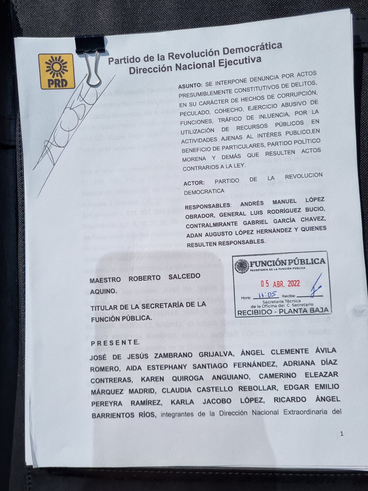 A la SFP acudieron el dirigente nacional, Jesús Zambrano; la secretaria general, Adriana Díaz; el representante ante el INE, Ángel Ávila y la secretaria de Asuntos Electorales, Claudia Castelo.