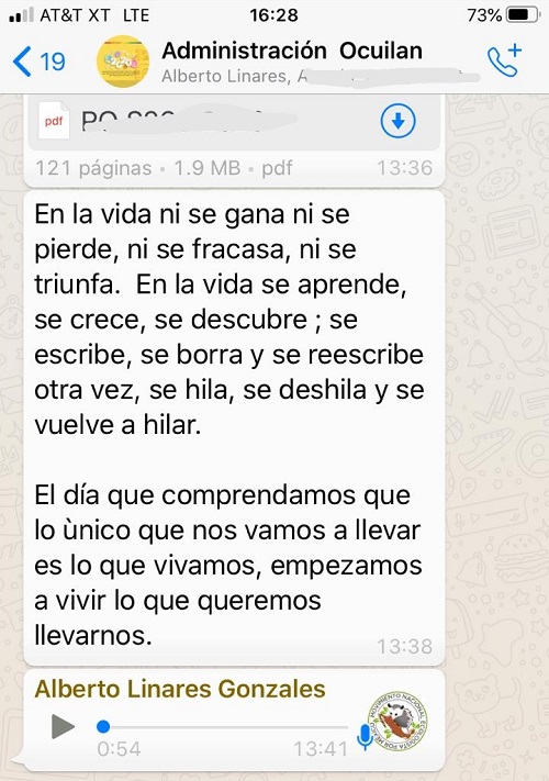 “Recordando las palabras del doctor que en vida compartía: ‘En la vida ni se gana ni se pierde, ni se fracasa, ni se triunfa. En la vida se aprende, se crece, se descubre; se escribe, se borra y se reescribe otra vez, se hila, se deshila y se vuelve a hilar. El día que aprendamos que lo único que nos vamos a llevar es lo que vivamos, empezamos a vivir lo que queremos llevarnos’”.