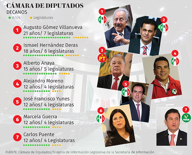 De acuerdo con los registros en el Palacio de San Lázaro y el Sistema de Información Legislativa de la Secretaría de Gobernación, el priista Augusto Gómez Villanueva suma siete legislaturas, equivalentes a 21 años, como diputado y senador desde 1964, y de hecho fue ya presidente de la Mesa de Decanos de la Cámara de Diputados en 2000.