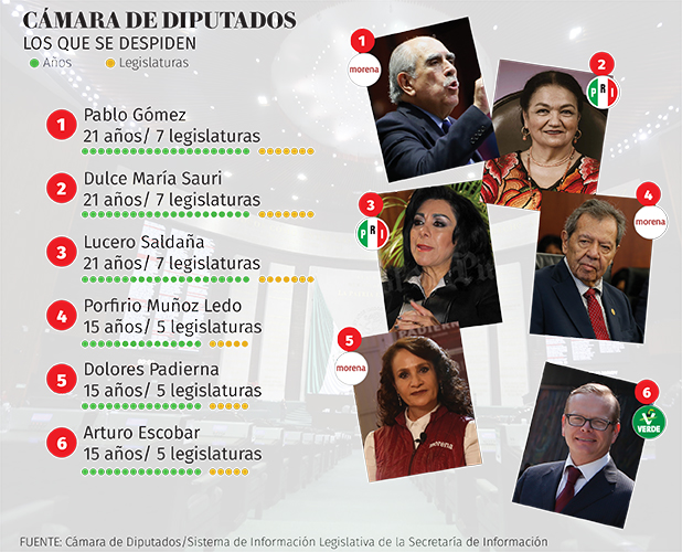 Destaca el caso de Pablo Gómez, quien sumó siete legislaturas y llegó a 21 años en el Congreso de la Unión durante el trienio por terminar en el Palacio de San Lázaro.
