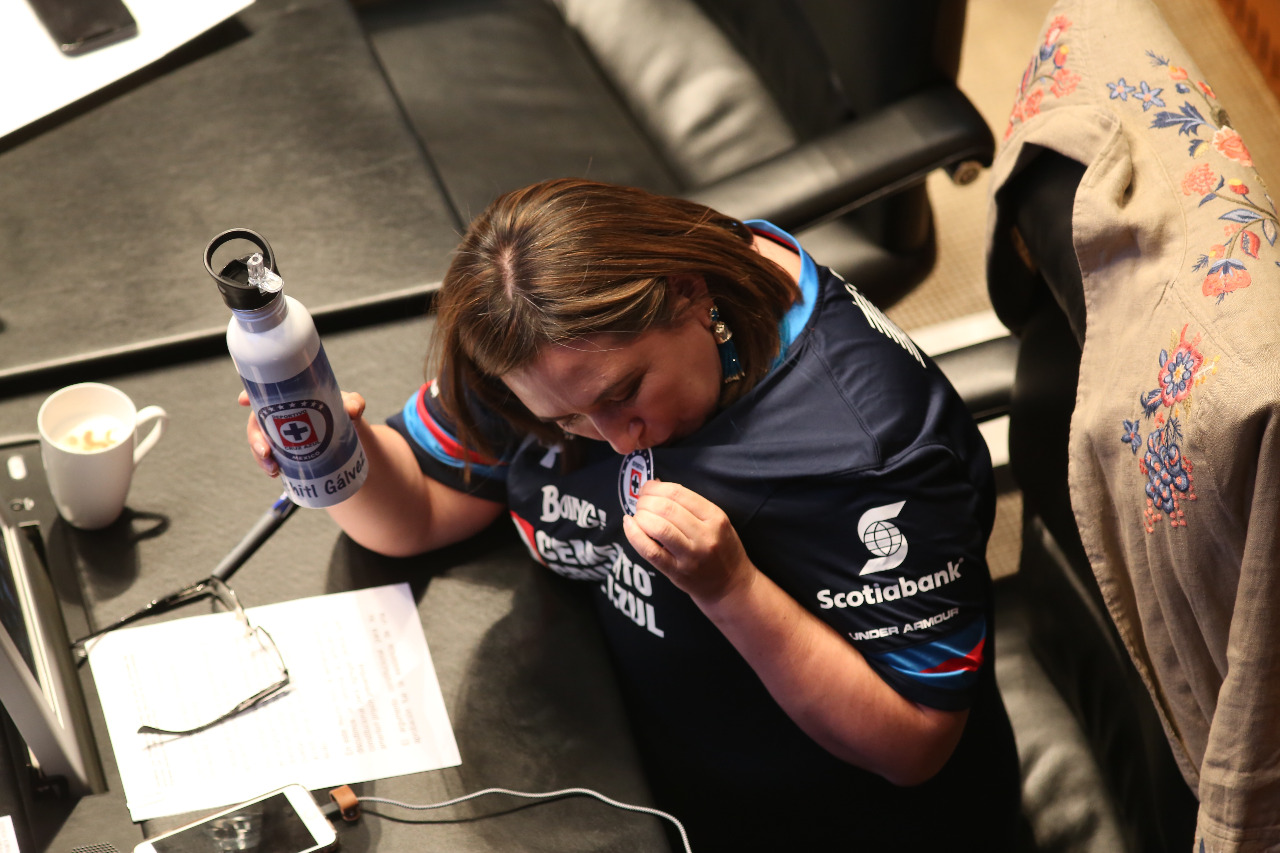 Es el caso de la senadora Xóchitl Gálvez, quien con pucheros, tuvo que ponerse la playera azul crema del equipo que venció 2-0 al Cruz Azul.