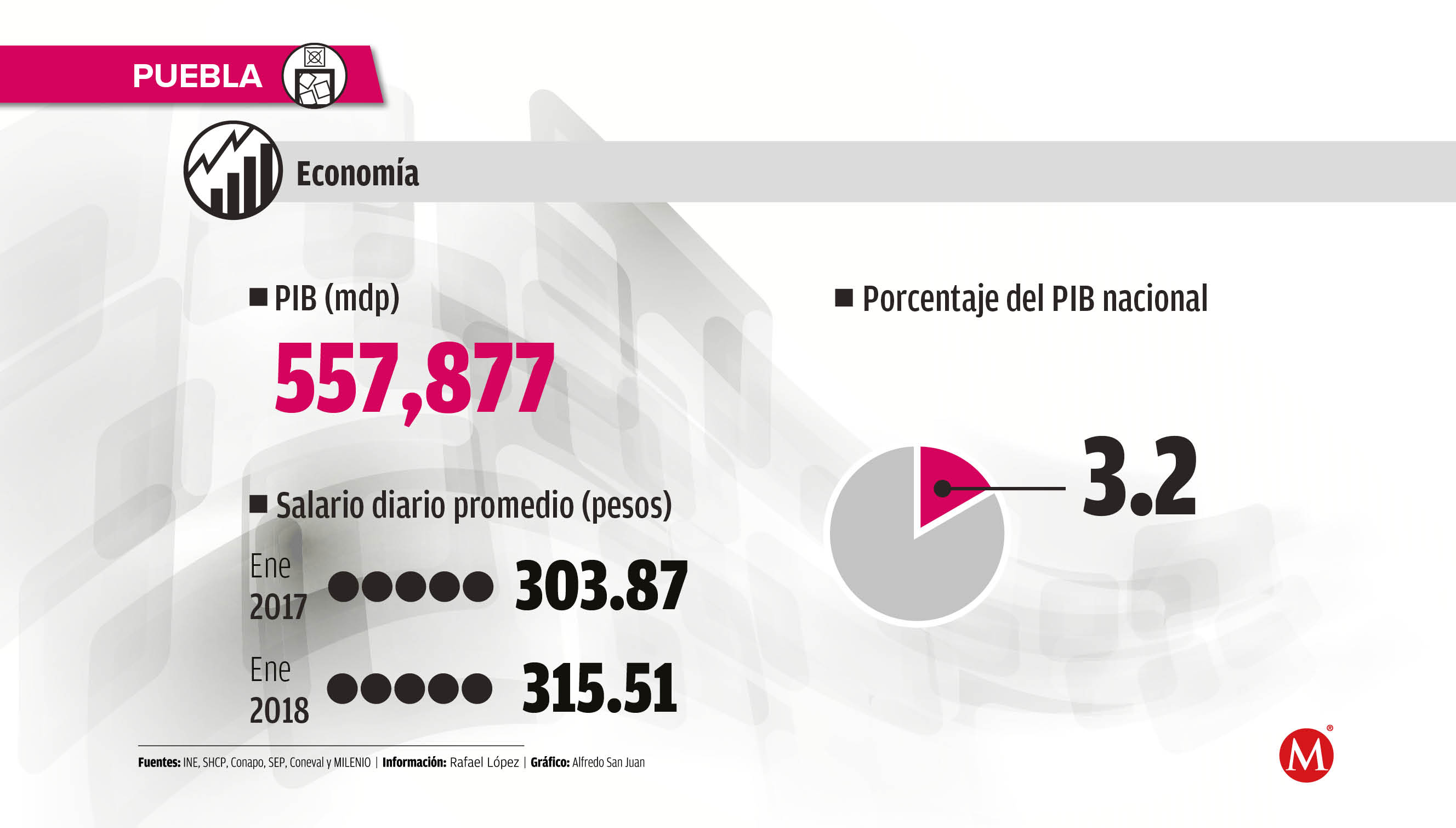 El Producto Interno Bruto (PIB) del estado es de 557 mil 877 millones de pesos, lo que representa una aportación de 3.2 por ciento al PIB nacional.