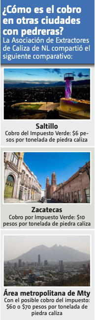 Al afirmar que nunca se les consultó o tomó en cuenta, la Asociación de Extractores de Caliza de Nuevo León condenó el Impuesto Verde propuesto por el gobierno del estado, pues considera que será impagable al ser 7 veces más alto que en cualquier lugar de México.