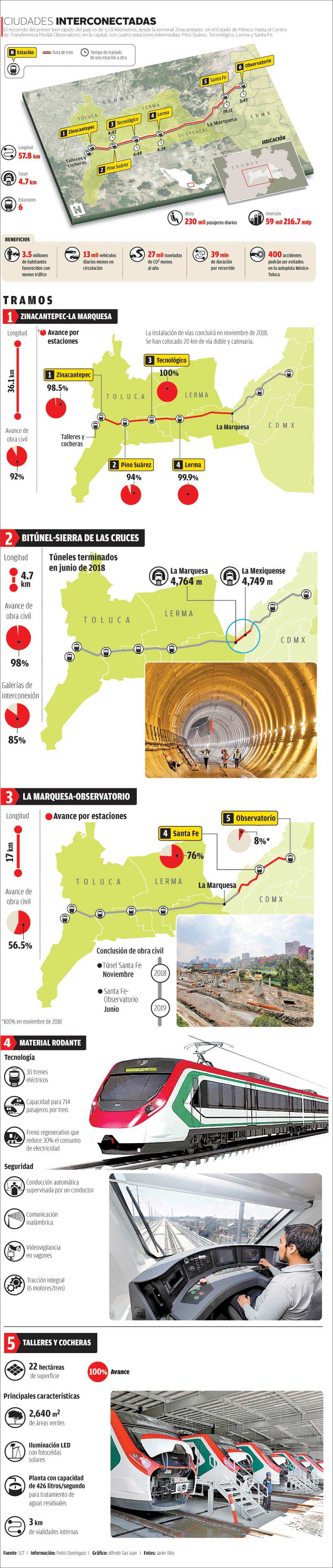 El proyecto, que tiene una inversión prevista de 59 mil 216 millones de pesos, permitirá que en el primer trimestre de 2020, 230 mil pasajeros viajen a diario en 39 minutos desde Toluca hasta Ciudad de México.