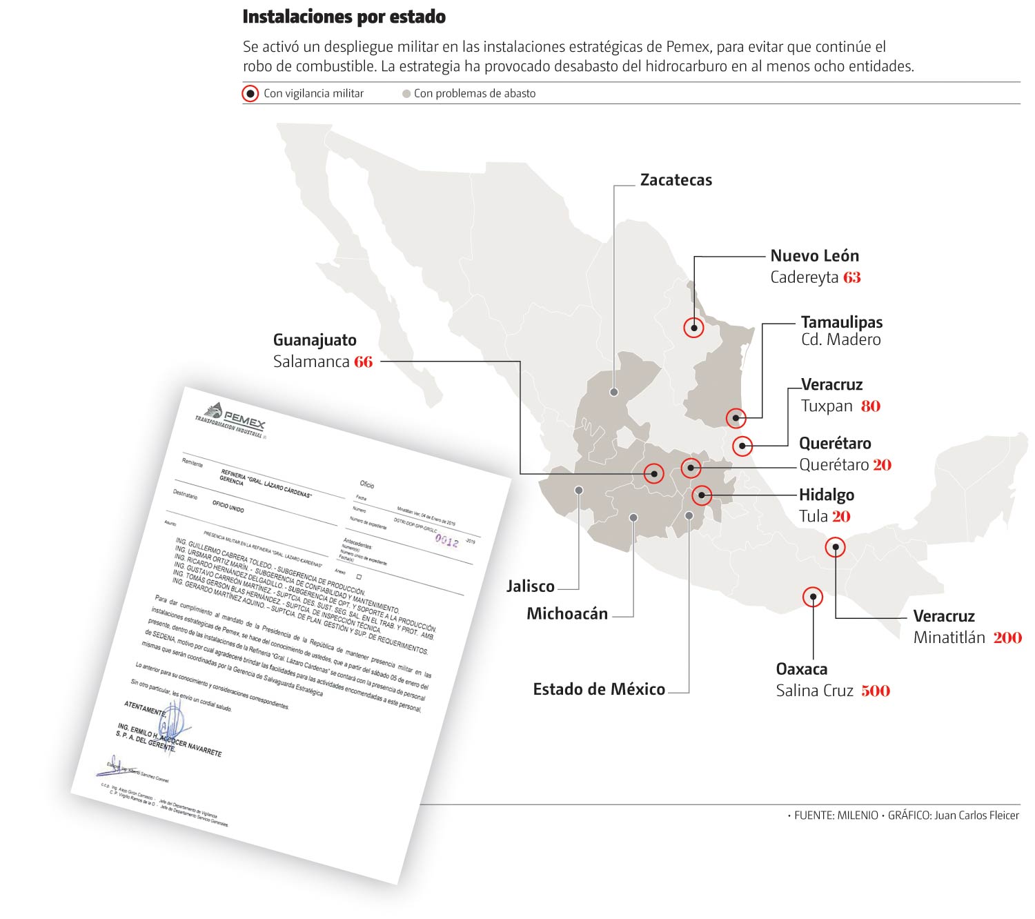 Sin detallar cuántos uniformados fueron asignados, los directivos de la refinería recibieron un oficio en el que se les notificó que para dar cumplimiento a un mandato de la Presidencia, a partir del 5 de enero se contaría con presencia de personal de la Sedena.