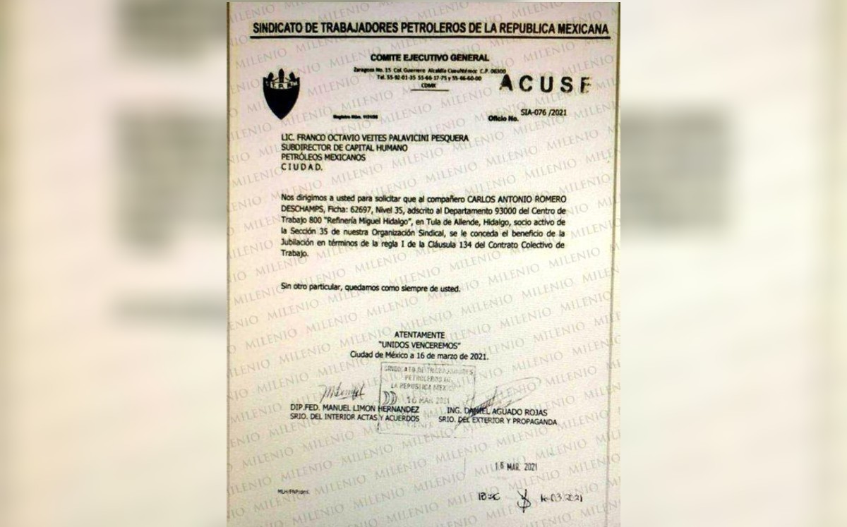 En el oficio dirigido al subdirector de capital humano de Pemex, Francisco Octavio Veites Palavicini, con fecha del 16 de marzo, el gremio solicitó que Carlos Romero Deschamps, con ficha: 62697, adscrito a la refinería de Miguel Hidalgo, en Tula, "se le conceda el beneficio de la jubilación en términos de la regla uno del Contrato Colectivo de Trabajo.