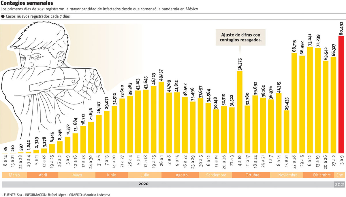 Actualmente se tiene confirmado el contagio de un millón 534 mil 39 personas; de éstos, 5.2 por ciento se registró en la semana del 3 al 9 de enero, periodo en el que la Secretaría de Salud federal reportó la positividad de 80 mil 492 pacientes, colocándose como la semana con récord de contagios desde que inició la pandemia.