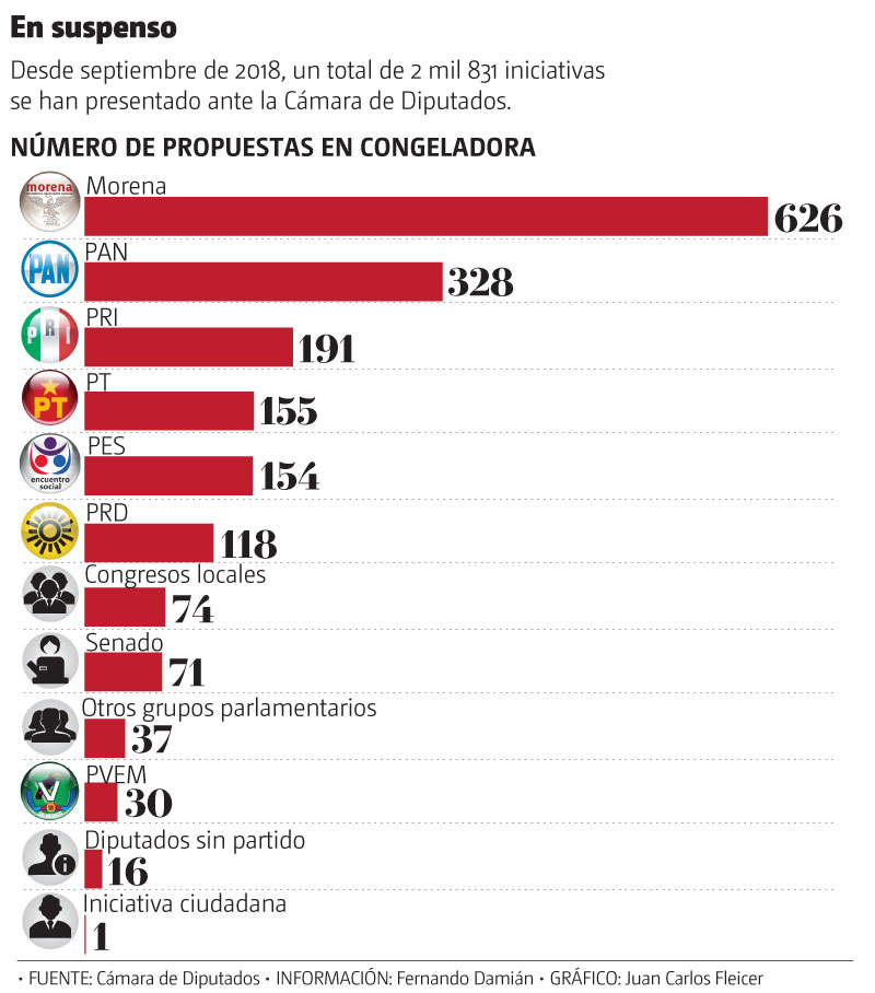 Los diputados de la mayoría parlamentaria de Morena han presentado hasta ahora un total de 833 iniciativas de ley, de las cuales 626 (75 por ciento) se encuentran congeladas.