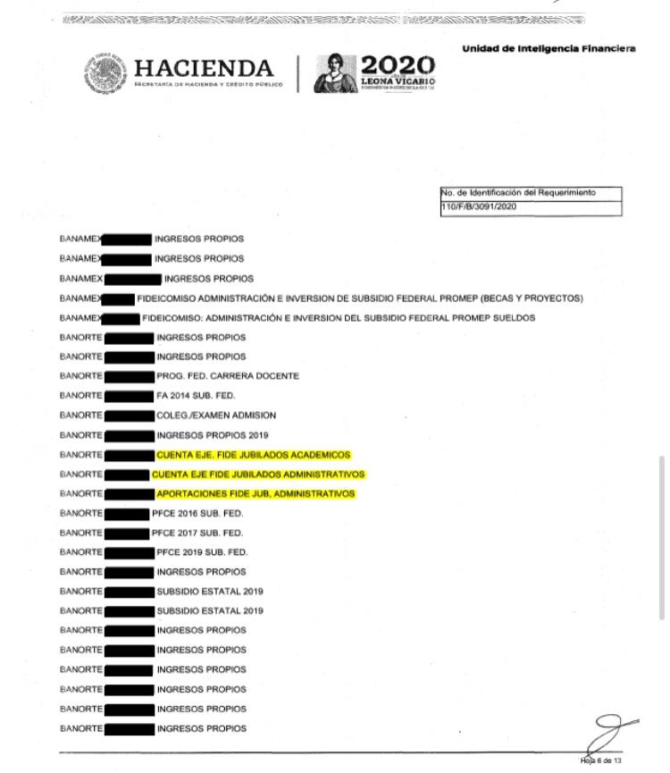 De acuerdo con la solicitud de bloqueo de cuentas bancarias emitido por la UIF y de la que MILENIO tiene una copia, se ordenó dejar a salvo 214 cuentas bancarias en las que la universidad recibía subsidios federales y estatales para el pago de nómina de académicos y administrativos, en las que reciben el pago de colegiaturas y con las que efectúa pago a proveedores e impuestos federales.