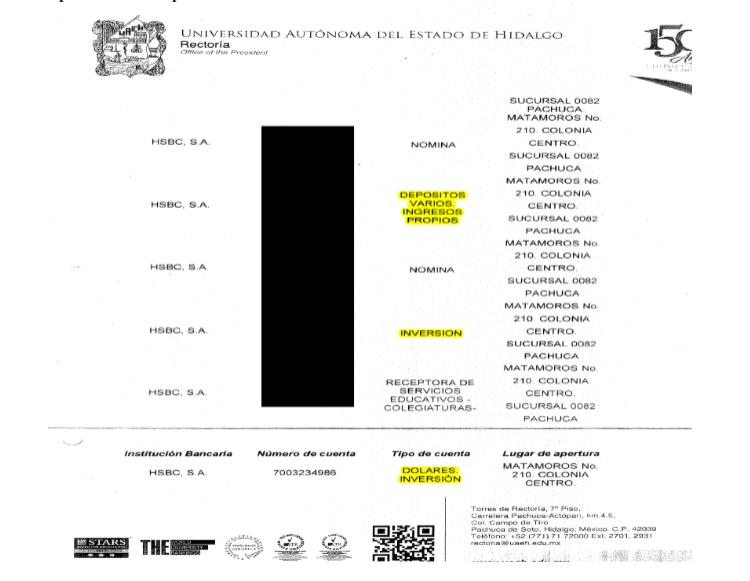 Actualmente permanecen bloqueadas seis cuentas bancarias que corresponden a 151 millones de dólares que están directamente relacionados con los negocios del presidente del patronato de la UAEH, Gerardo Sosa Castelán, en donde "se mezcló lo público (recursos) con lo privado". Por lo que "también es falso" que estos recursos pertenezcan al fondo de jubilados.
