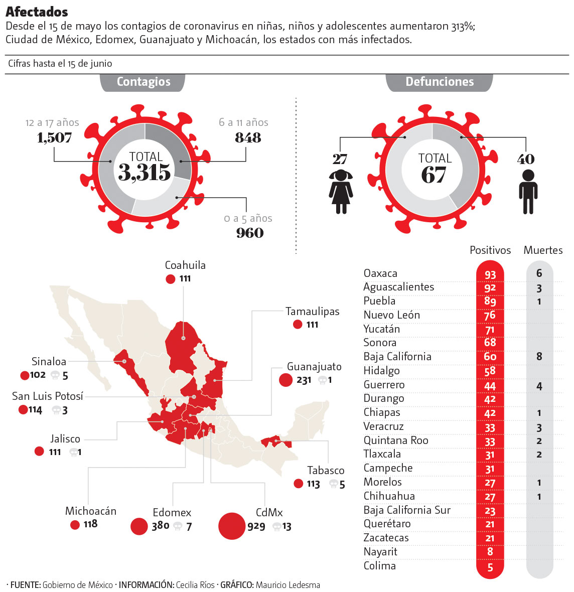 El pasado 7 de marzo un joven de 17 años en Ciudad de México fue el primer paciente en dar positivo a SARS-Cov2 en el grupo de edad de 0 a 17 años. Desde esa fecha y hasta el 15 de mayo se reportaron 803 casos positivos, 442 de sexo masculino y 361 femenino. Para el 13 de junio, la cifra aumentó en 313 por ciento, con el registro de 2 mil 410 casos nuevos.