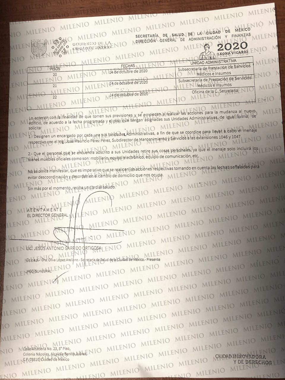 De acuerdo con documentos emitidos por SEDESA, obtenidos por MILENIO, la circular SSCDMX/DGAF/035/2020, señala que debido a "necesidades" de la institución de tomó la decisión de cambiar de sede, en cual se concentrarán los empleados de todos los organismos que dependen de esta.