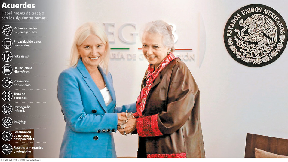 La secretaria de Gobernación, Olga Sánchez Cordero, y la vicepresidenta de Global Marketing Solutions de Facebook, Carolyn Everson, acordaron establecer una agenda de trabajo con el objetivo de dar un mejor uso a las herramientas digitales y detectar crímenes cibernéticos, prevenir suicidios y proteger los datos personales de los usuarios.