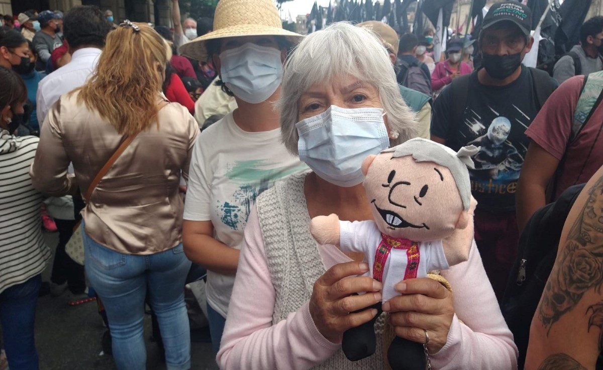 Rosa María Zamudio, simpatizante de López Obrador, lleva un cubrebocas con la cara del Presidente que mandó a hacer con un familiar, asegurando que para ella es como tener una parte de su corazón en su rostro.