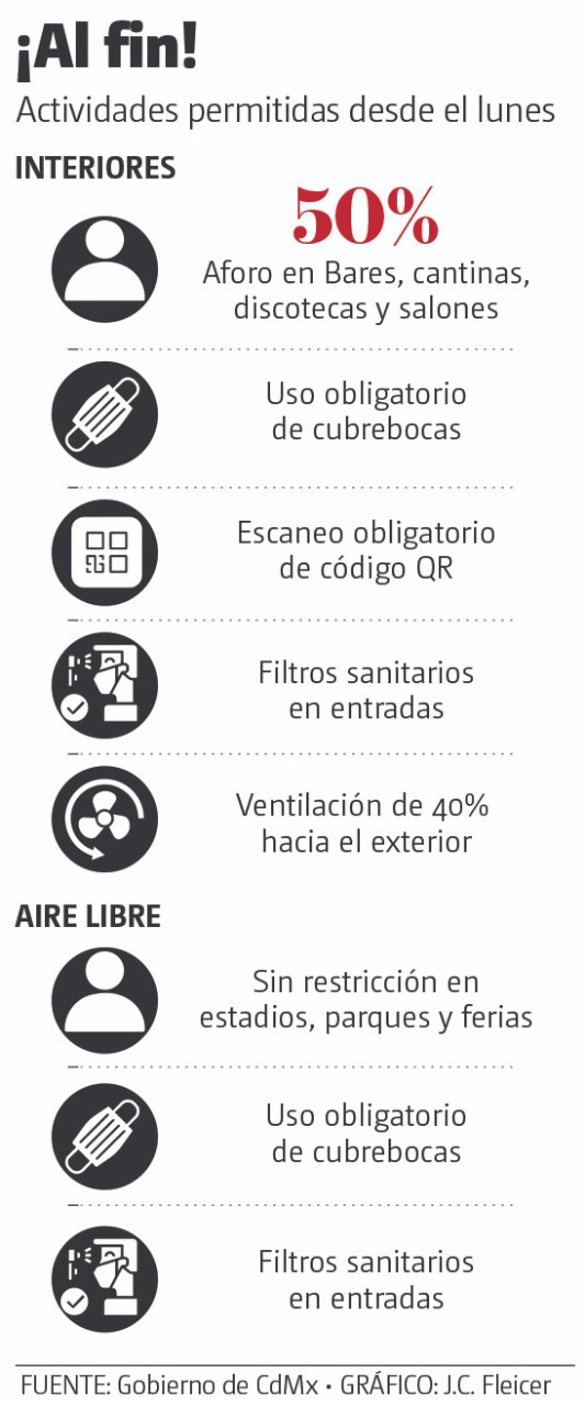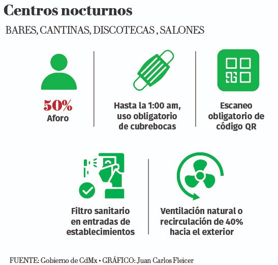 El titular de la Agencia Digital de Innovación Pública, Eduardo Clark García Dobarganes informó que a partir del lunes, los bares, cantinas y discotecas de la Ciudad de México podrán operar al 50 por ciento de su capacidad y operar hasta las 01:00 horas, manteniendo las medidas de salud de uso de cubrebocas y filtro sanitario.