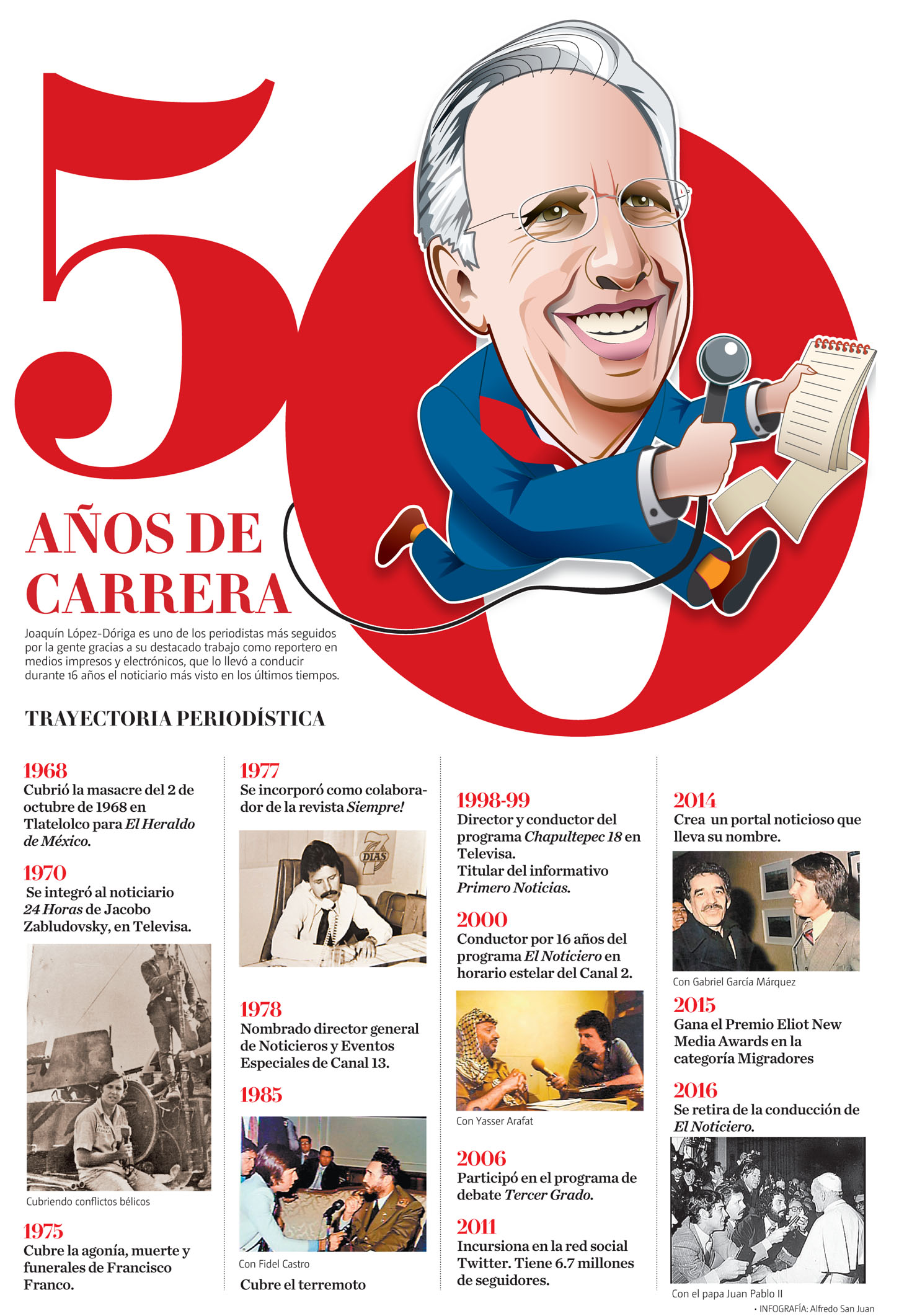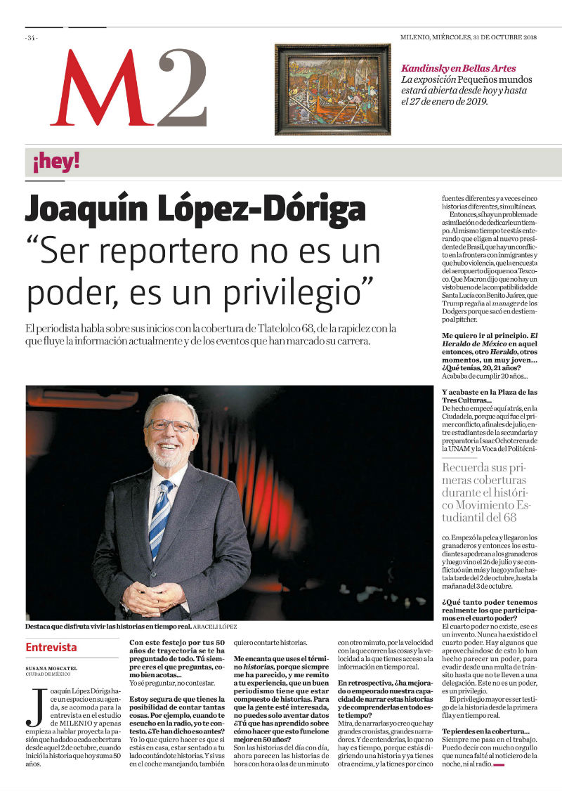 Joaquín López Dóriga hace un espacio en su agenda, se acomoda para la entrevista en el estudio de MILENIO y apenas empieza a hablar proyecta la pasión que ha dado a cada cobertura desde aquel 2 de octubre, cuando inició la historia que hoy suma 50 años.