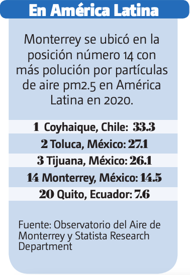 "En 2020, la ciudad de Coyohaique, ubicada al sur de Chile, se posicionó como la ciudad latinoamericana con la peor calidad del aire, basándose en la concentración de materia particulada de un diámetro igual o menor a 2.5 micras", señaló por otro lado la publicación del Observatorio del Aire de Monterrey.