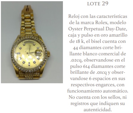 Entre las piezas ofertadas por el SAE también hay un reloj tipo Rolex cuya autenticidad no puede ser confirmada pues carece de los sellos y registros característicos de las piezas originales. Pero sus componentes de oro y diamantes permiten que el precio de salida del lote 29 sea de 44 mil 500 pesos.