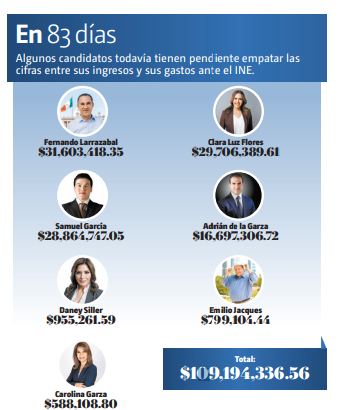 En los últimos 16 días, Clara Luz Flores Carrales y Samuel García Sepúlveda son los candidatos a la gubernatura que más han gastado en sus campañas, entre los dos acumulan un incremento de más de 13 millones de pesos.