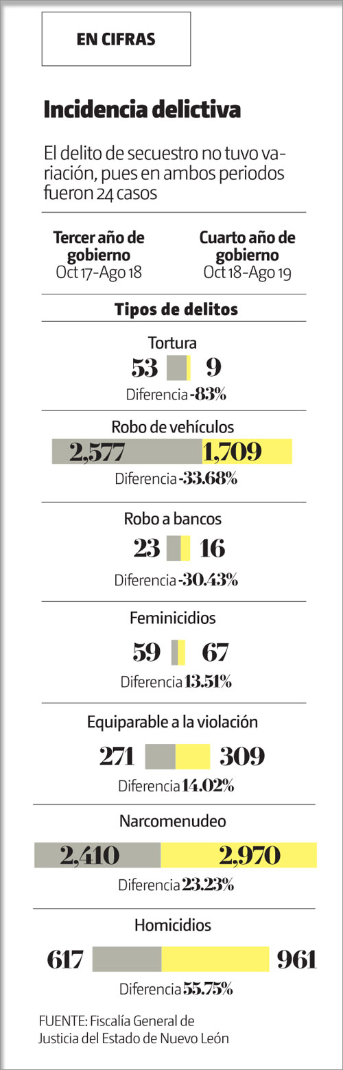 Mientras que seis de esos 20 delitos fueron al alza durante el cuarto año de gobierno del Bronco.