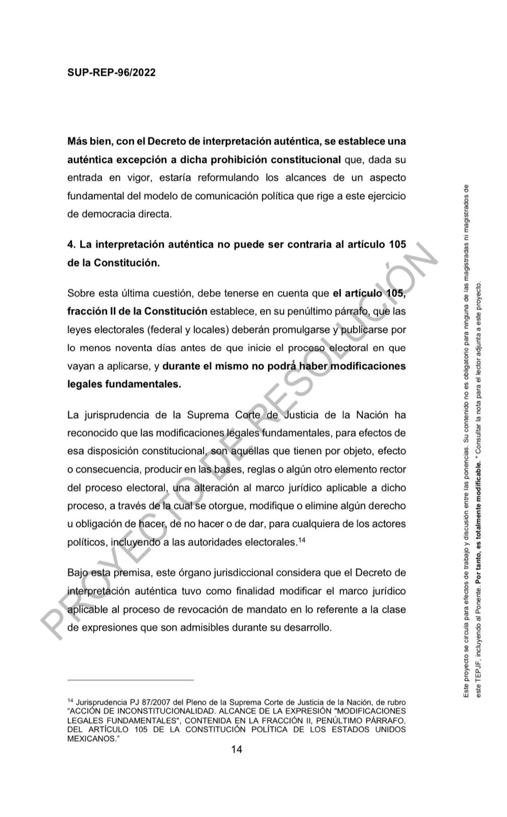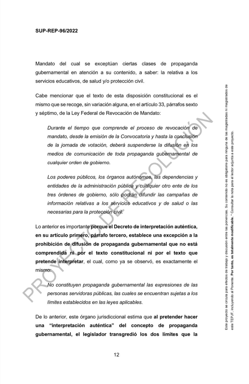 Sobre las impugnaciones para que basándose en este decreto se revocaran las medidas cautelares para retirar el comunicado titulado “gobernadores y gobernadoras de la cuarta transformación”, el magistrado también declara que “sí es una instancia de propaganda gubernamental, por lo que su difusión durante el proceso de revocación de mandato es un acto susceptible de medidas cautelares”.