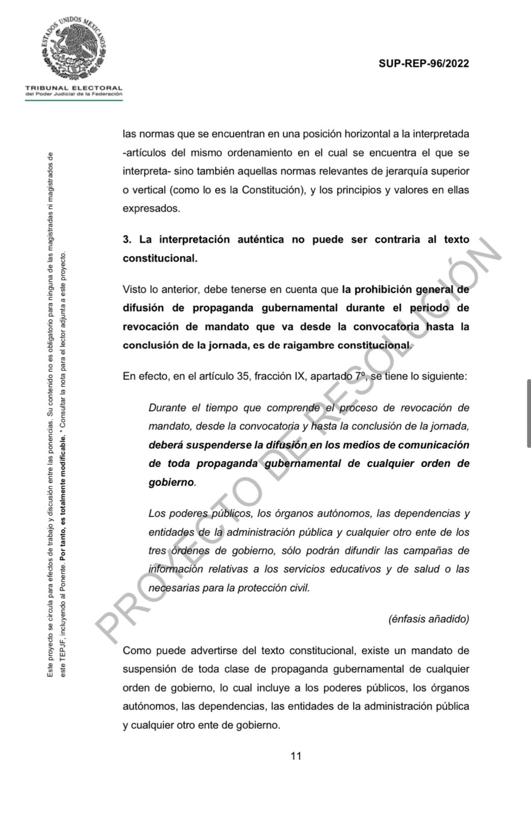 “En el texto constitucional existe el mandato de suspensión de toda clase de propaganda gubernamental de cualquier orden de gobierno, lo cual incluye a los poderes públicos, los órganos autónomos, las dependencias, las entidades de administración pública y cualquier otro ente de gobierno durante el proceso de revocación de mandato”, indica el proyecto.
