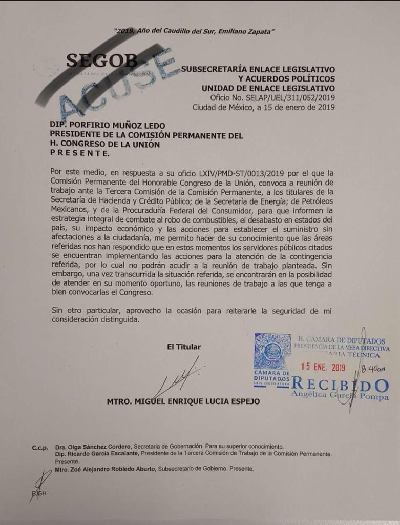 En entrevista con Ciro Gómez Leyva, Mario Delgado, presidente de la Junta de Coordinación Política y líder parlamentario de Morena en el Palacio de San Lázaro, detalló que la secretaría de Gobernación Olga Sánchez Cordero, le notificó alrededor de la una de la mañana la suspensión y aplazamiento de la presentación de los funcionarios, quienes atenderían asuntos de logística de la distribución de combustibles.