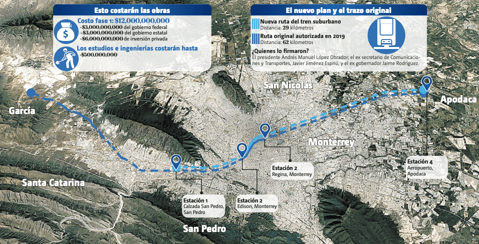 San Pedro, Monterrey, San Nicolás y Apodaca, con un recorrido de 29 kilómetros; con esto, la diferencia entre ambos proyectos es de 33 kilómetros.