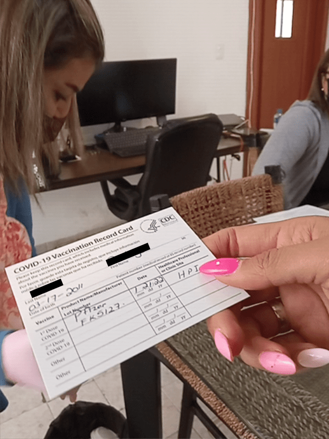 El encargado de cobrar las dosis dice llamarse Luis Villa. Él asegura que con el certificado que entregan, el menor puede entrar a Estados Unidos sin problema alguno. Incluso da un comprobante con el logo de los Centros para el Control y la Prevención de Enfermedades de aquel país, el cual incluye los datos personales, la fecha y la vacuna recibida, así como el supuesto lugar de la aplicación con las siglas HPI.