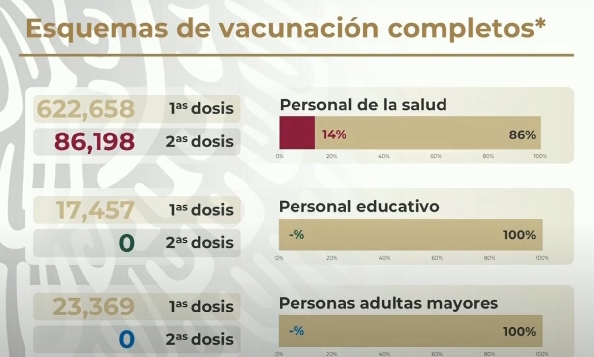 De los 726 mil 313 trabajadores de la salud y de la educación que han recibido la vacuna, sólo 622 mil 658 han recibido la primera dosis y 86 mil 198 el esquema completo, en las 11 categorías de la primera línea de batalla contra covid-19.