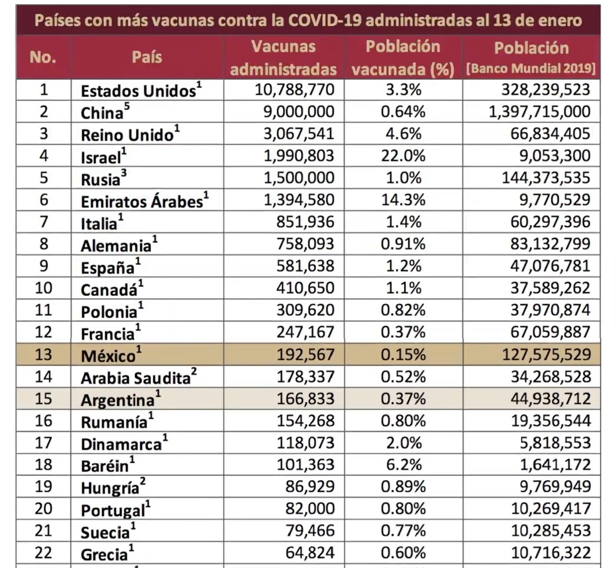 De los países con más vacunas anticovid aplicadas al 13 de enero, Estados Unidos ocupa el primer lugar con 10 millones 788 mil 770 dosis aplicadas; le sigue China, con 9 millones; Reino Unido, 3 millones 67 mil 541, mientras que México se ubica en el lugar 13, con 192 mil 567, "dos lugares por arriba de Argentina", destacó López-Gattel, pues el país sudamericano ocupa el lugar 15, con 166 mil 833 vacunas administradas.