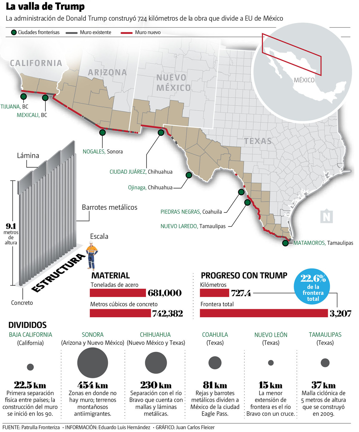 En los 3 mil 207 kilómetros de frontera compartida entre México y Estados Unidos existen actualmente más de mil 700 kilómetros con algún tipo de barrera hecha por el hombre. De estos, cerca de mil kilómetros fueron construidos en otras administraciones, principalmente en la de George W. Bush, aunque su primer antecedente data, en realidad, de la presidencia de su padre, George H.W. Bush, en 1992.