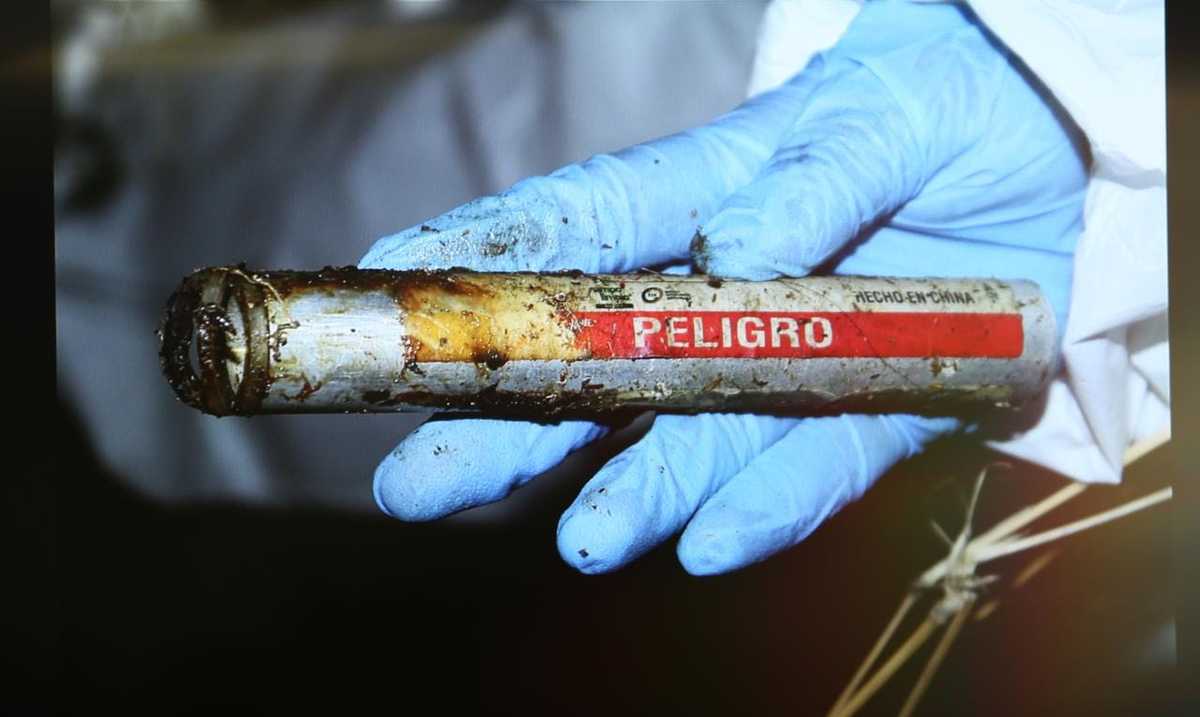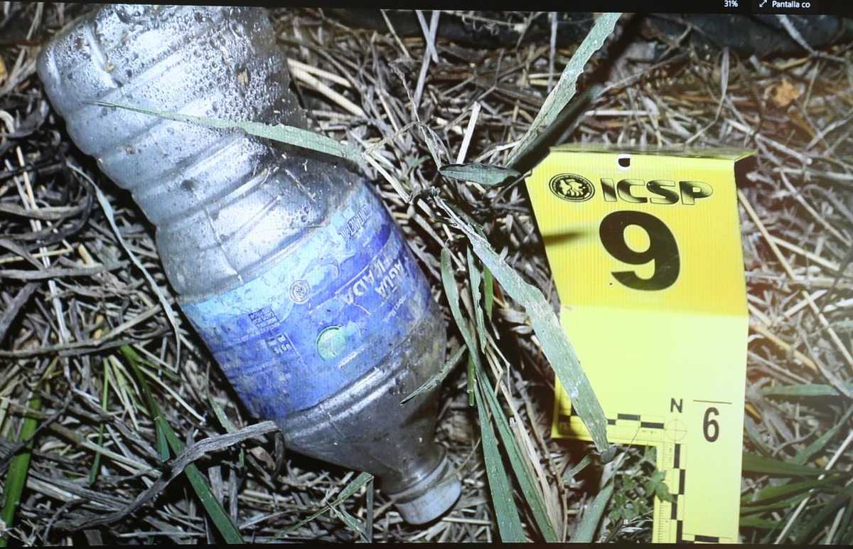 También dos botellas de agua que estaban junto al cadáver, y un recipiente alargado con la leyenda "peligro" que podría contener fosfuro de aluminio.