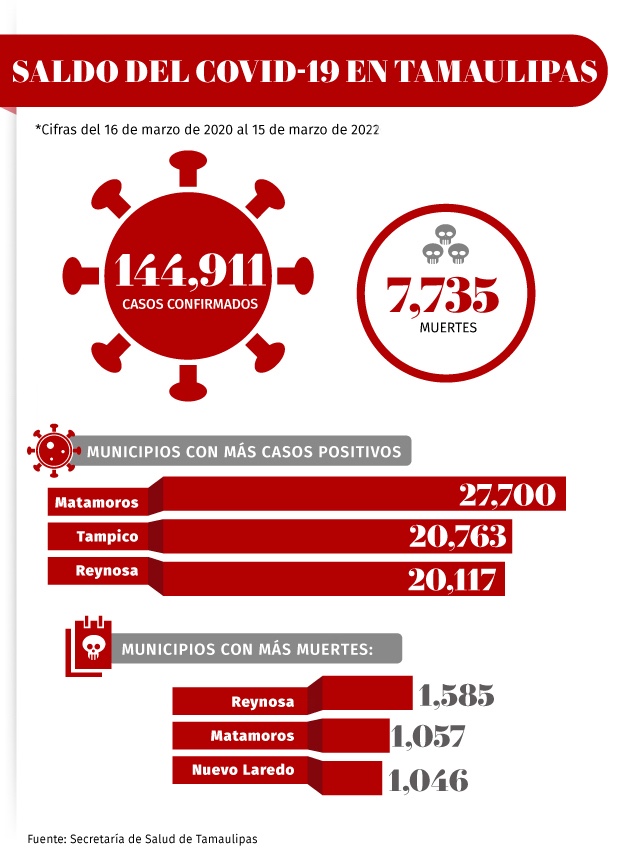 Hace dos años, en Tamaulipas se confirmó el primer paciente con covid-19, desde ahí hubo muchos cambios en la entidad debido a la pandemia. El estado ha enfrentado cuatro olas de contagios, la más severa en enero pasado cuando se tuvo el pico más alto de 1,744 contagios en un día.