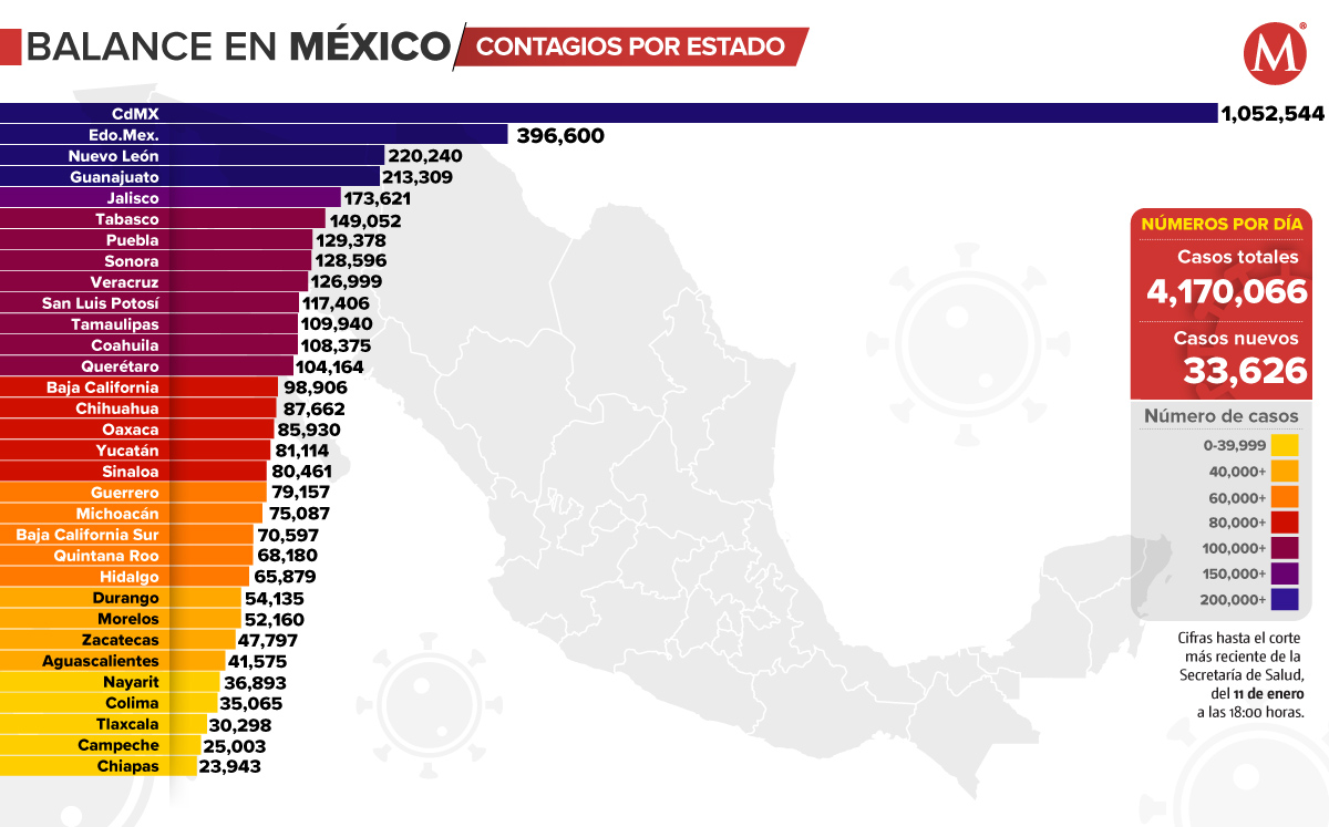 En México hay un acumulado de 4 millones 170 mil 66 casos de coronavirus, sumando 33 mil 626 contagios en las últimas 24 horas, y de acuerdo con la Secretaría de Salud, es la cifra más alta en en el país en lo que va de la pandemia.