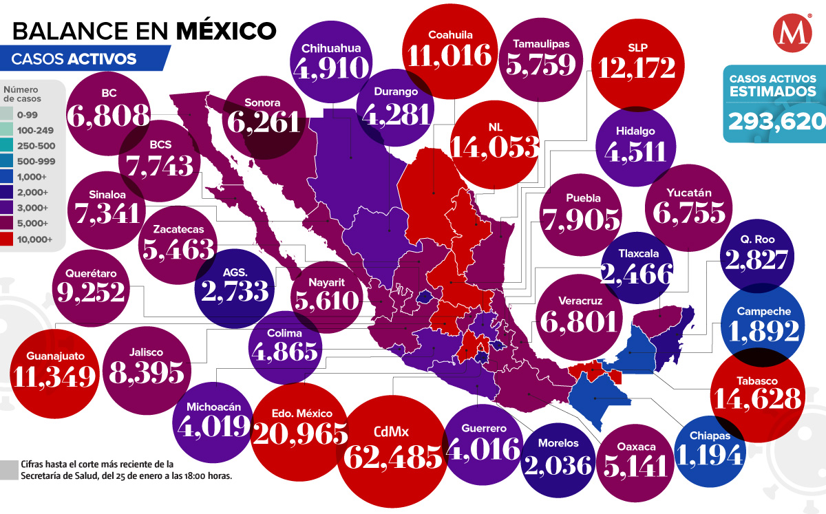 En Ciudad de México se estiman 62 mil 485 casos activos, el Estado de México tiene 20 mil 965 contagios, Tabasco contabiliza 14 mil 628, Nuevo León reporta 14 mil 053 y en Guanajuato hay 12 mil 172.