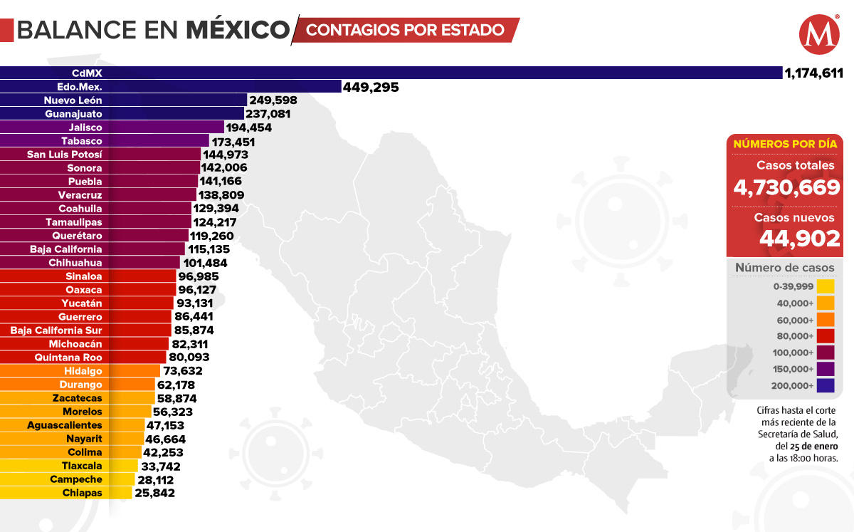 En México hay un acumulado de 4 millones 730 mil 669 casos de coronavirus, sumando 44 mil 902 contagios en las últimas 24 horas, de acuerdo con la Secretaría de Salud.