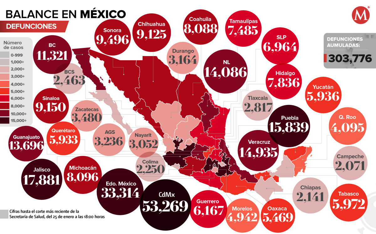 En Ciudad de México hay 53 mil 269 decesos acumulados, el Estado de México confirma 33 mil 314, Jalisco contabiliza 17 mil 881, Puebla registra 15 mil 839 y Veracruz tiene 14 mil 935.