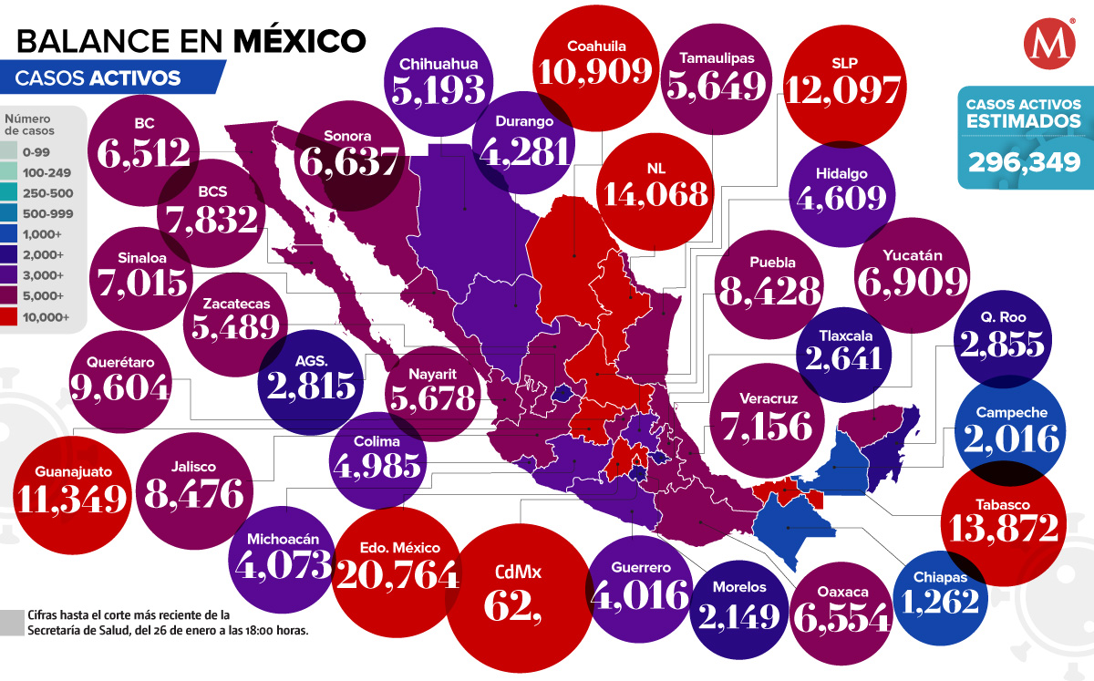 En Ciudad de México se estiman 62 mil 876 casos activos, el Estado de México tiene 20 mil 764 contagios, Nuevo León contabiliza 14 mil 068, Tabasco reporta 13 mil 872 y en Guanajuato hay 11 mil 501.