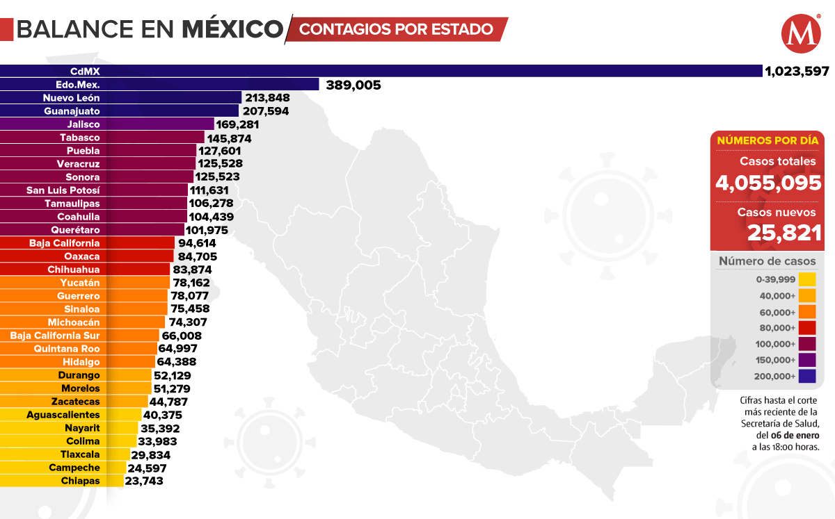 En México hay un acumulado de 4 millones 55 mil 095 casos de coronavirus, sumando 25 mil 821 contagios en las últimas 24 horas, de acuerdo con la Secretaría de Salud.