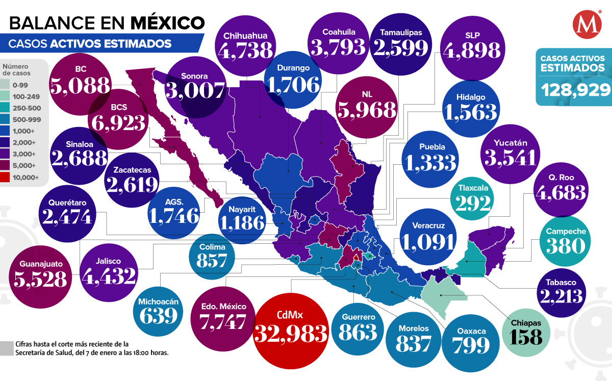 En Ciudad de México se estiman 32 mil 983 casos, representando el 25.58 por ciento de activos en el país. Estado de México tiene 7 mil 747 contagios, Baja California Sur reporta 6 mil 923, Nuevo León contabiliza 5 mil 968, y en Guanajuato hay 5 mil 528.