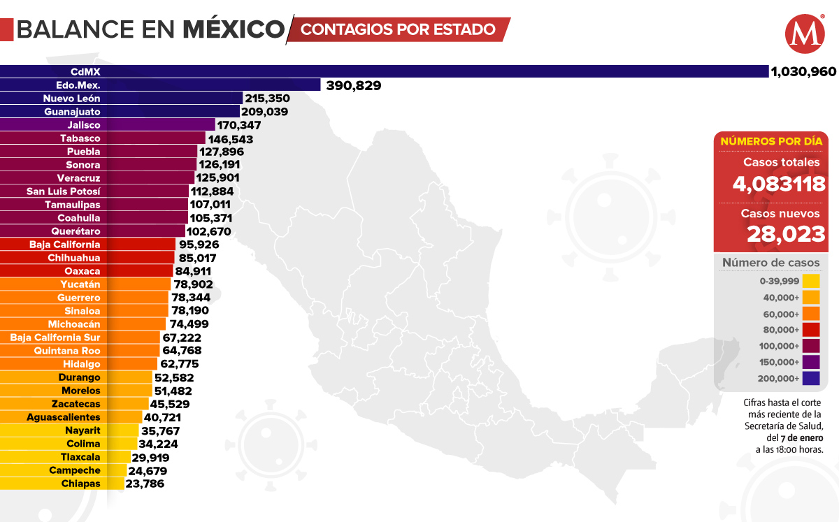 En México hay un acumulado de 4 millones 83 mil 118 casos de coronavirus, sumando 28 mil 023 contagios en las últimas 24 horas, de acuerdo con la Secretaría de Salud.