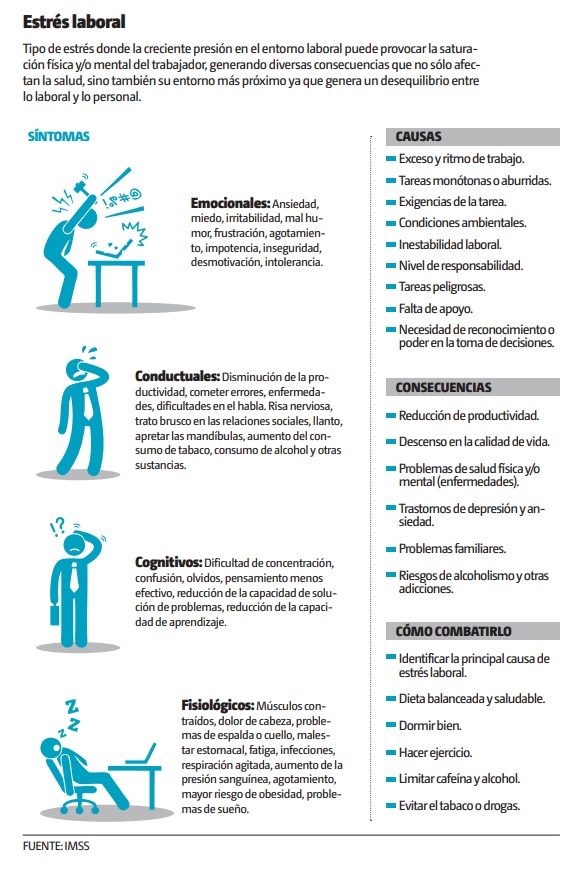 Según el Instituto Mexicano del Seguro Social (IMSS), el estrés laboral se presenta donde existe una creciente presión en el entorno laboral y puede provocar saturación física y/o mental del trabajador, generando consecuencias que no sólo afectan a la salud sino también a su entorno más próximo ya que se genera un desequilibrio entre lo laboral y lo personal.