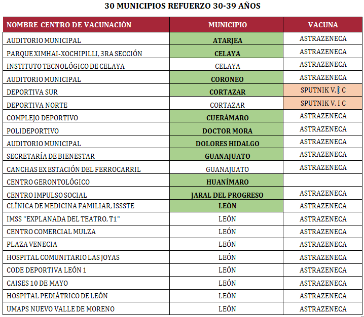 Este miércoles comenzará la vacunación de refuerzo para personas de 30 a 39 años en el estado de Guanajuato, donde fueron puestas a disposición más 355 mil 200 dosis, en las que se consideran la marca AstraZeneca y Sputnik; en esta jornada también podrán acercarse los rezagados a completar su esquema de inmunidad.