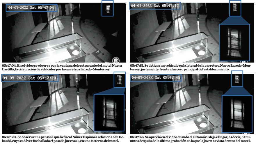 En uno de los videos tomados por una cámara instalada dentro del restaurante del motel se observa que a las 05:47:15 del sábado, un vehículo se detiene en la lateral de la carretera Nuevo Laredo-Monterrey, frente a la puerta del local.
