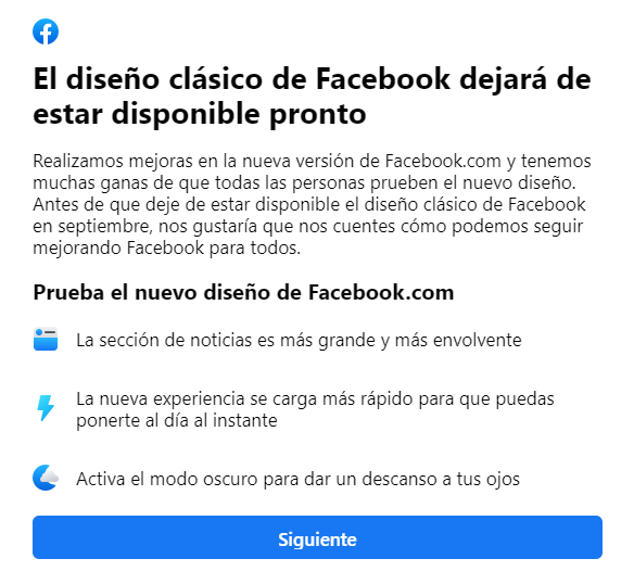 Facebook lanzará para todos los usuarios de su versión de escritorio su nuevo diseño el próximo septiembre. Éste se anunció hace más de un año y que modifica su apariencia tradicional en azul habilitando un modo oscuro, y en esta ocasión hará que sea obligatorio y no permitirá volver a la vista clásica.