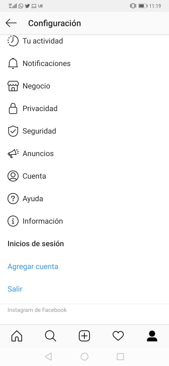 Pues ahora, la app cuenta con la frase "Instagram de Facebook" que ya aparece dentro del menú de configuración.